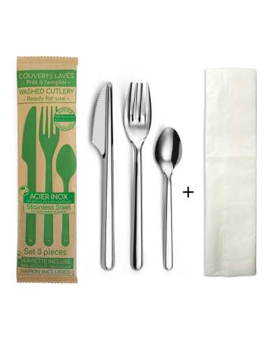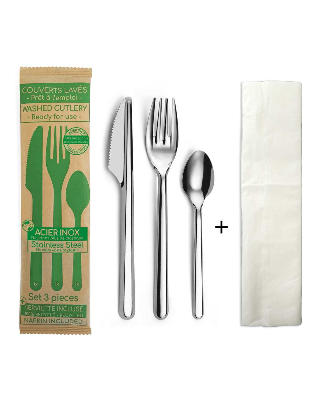 Fourchette-couteau- cuillère + serviette - Prêt à l’emploi (pièces lavées)- 100% recyclé. Inox Epaisseur de base 0.5mm. Carton de 50 kits.
