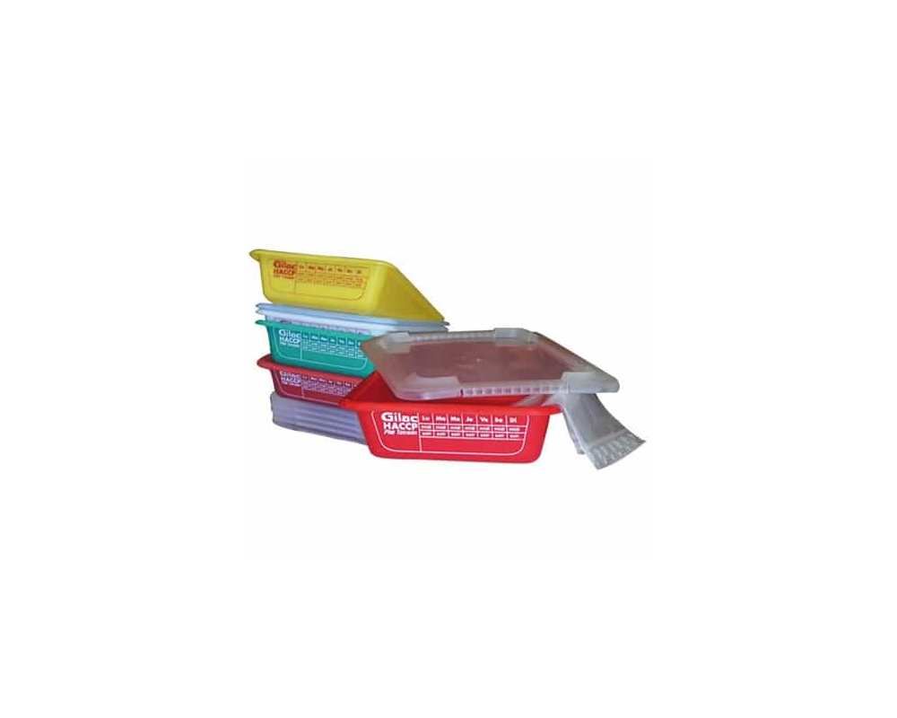 (1 bac de chaque couleur : Rouge, blanc, bleu, vert, jaune ) - Pour le stockage des plats témoins. Concept global : bacs dédiés + sachets plastiques. Facilite l’application de la réglementation sur la conservation des échantillons témoins. Existe en lot de 7.