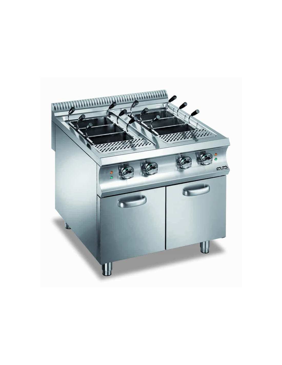 Le plan de travail emboutit est réalisé en acier inoxydable AISI304, il possède des angles arrondis pour la récuperation des liquides. Les cuves sont réalisées en acier inoxydable anti corrosion AISI316, et possèdent une zone de trop plein permettant dévacuer les amidons. Les angles sont arrondis pour faciliter le nettoyage, La grille dégouttage permet de deposer le panier de cuisson. Les paniers (option) sont réalisés en acier inoxydable AISI304 et sont équipés de poignées anti-chaleur. Version gaz: Bruleur acier à fl amme stabilisée. Thermocouple et vanne de sécurité. Allumage piezzo. Version electrique: résistances chauffantes blindées, réglage de la chauffe avec contacteur 4 positions et thermostat de sécurité.