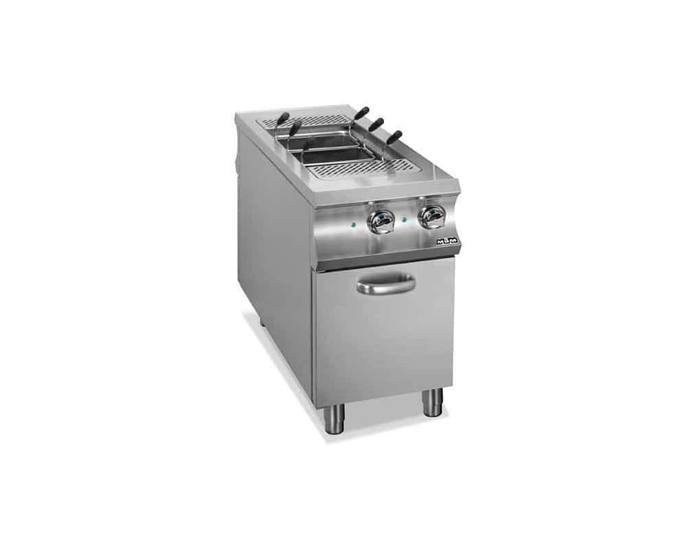 Le plan de travail emboutit est réalisé en acier inoxydable AISI304, il possède des angles arrondis pour la récuperation des liquides. Les cuves sont réalisées en acier inoxydable anti corrosion AISI316, et possèdent une zone de trop plein permettant dévacuer les amidons. Les angles sont arrondis pour faciliter le nettoyage. La grille dégouttage permet de deposer le panier de cuisson. Les paniers (option) sont réalisés en acier inoxydable AISI304 et sont équipés de poignées anti-chaleur. Version gaz: Bruleur acier à fl amme stabilisée. Thermocouple et vanne de sécurité. Allumage piezzo. Version electrique: résistance chauffantes blindées, réglage de la chauffe avec contacteur 4 position et thermostat de sécurité