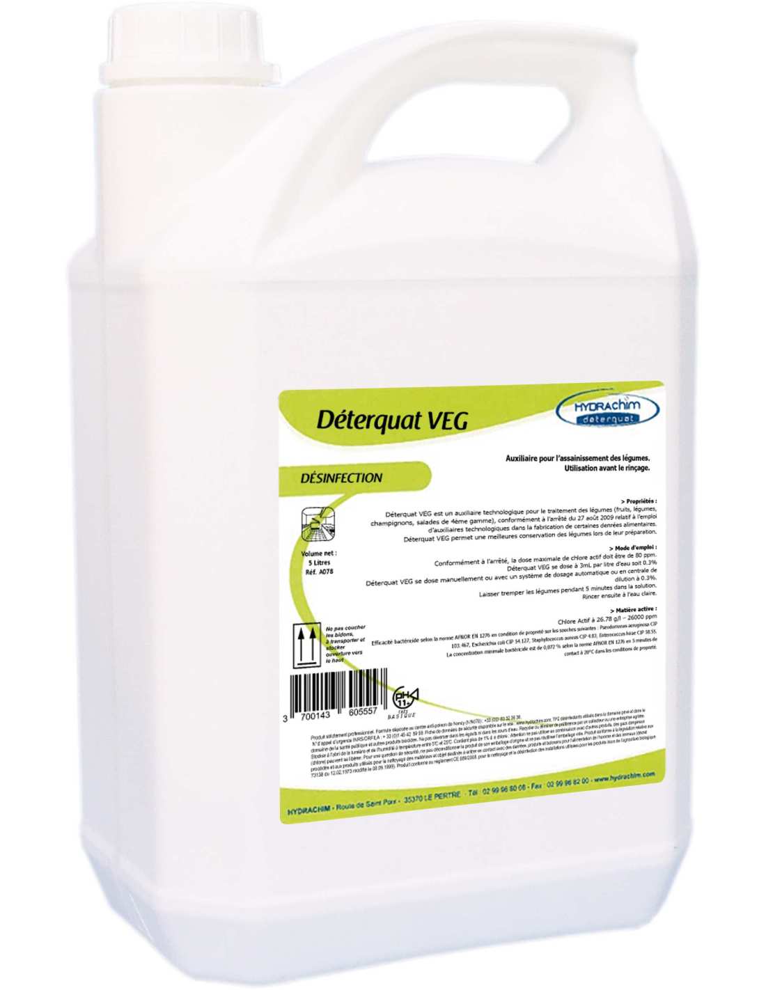 Produit auxiliaire pour décontaminer avant rinçage les légumes et les fruits, plus généralement les fabrications des denrées alimentaires de la quatrième gamme. Facilite la conservation des fruits et légumes lors de la préparation.