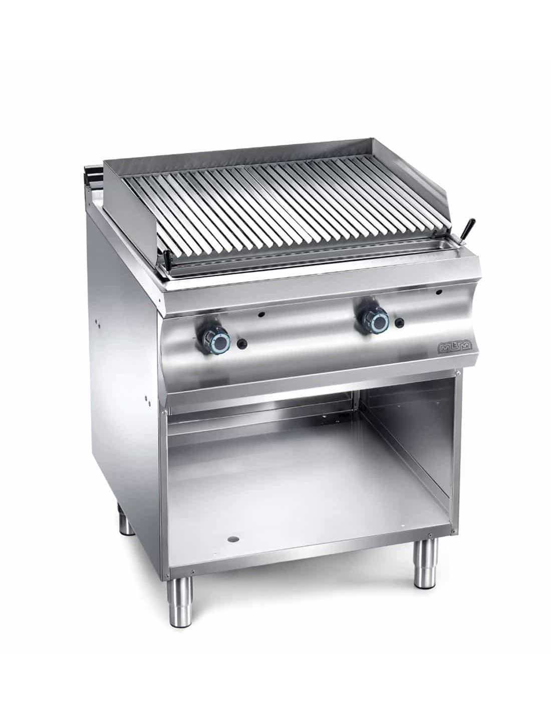 >Grille à pierre lavique, réchauffement à gaz au moyen d'un bruleur en acier inox à flamme stable, soupape de sécurité et thermocouple, plan de cuisson viande réalisé en grille d'acier inox AISI 304, tiroir à cendres et à scories extractible, structure extérieure en acier inox AISI 304.