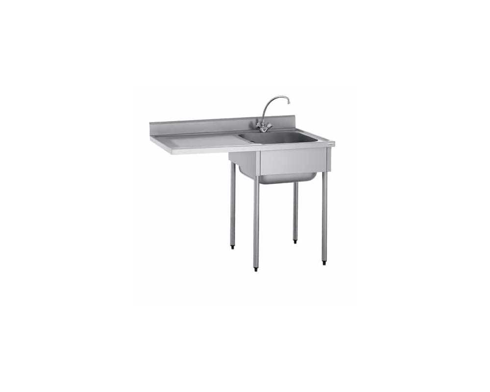 1200x700x900 mm - Sans robinet - 1 égouttoir suspendu à gauche - Construction en acier inoxydable alimentaire - Hauteur 900 mm - Bandeau avant hauteur 40 mm - Dosseret plié hauteur 100 mm - Bacs profondeur 300 mm - Habillage 3 faces - Piétement en tube en acier inoxydable alimentaire Ø38 mm avec vérins réglables, en retrait à l’arrière de 80 mm - Plonges adossées inox avec passage machine à laver - Egouttoir nervuré penté, bords anti-ruissellement - Confort acoustique grâce au bac et à l’égouttoir insonorisés.