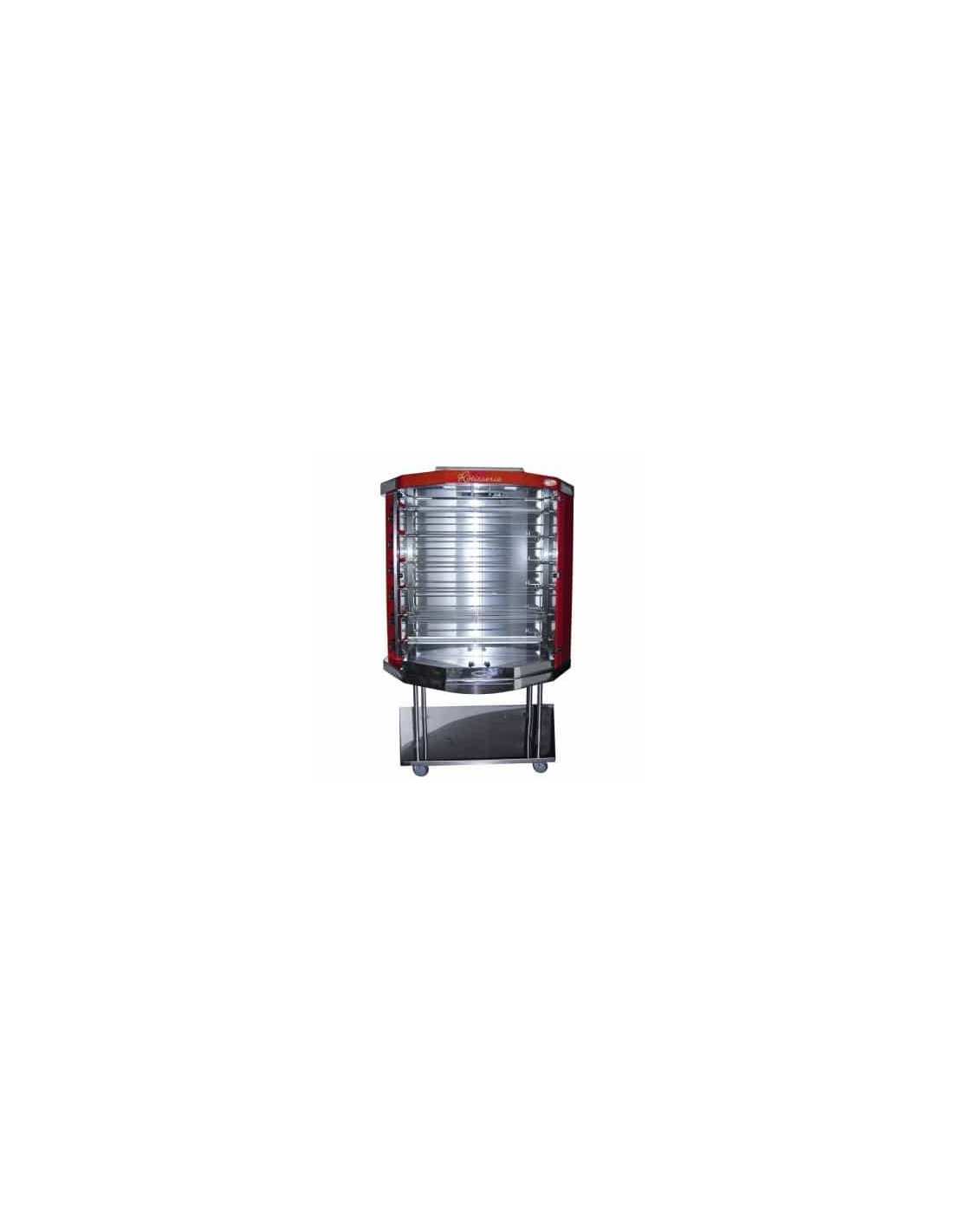 Construction tout inox. • Vitres bombées panoramiques. • 4, 6 ou 8 ® équipées de poignées athermiques pour faciliter la manipulation et l’embrochage. • Un moteur par broche. • 3 positions de cuisson. • Grand tiroir de stockage pour cuissons et pommes de terre. • Tablette de service coulissante. • Filtre et toit inox piégeant les graisses. • Système de chauffe par résistances épingle de 4 kW chacune. • Eclairage quartz intensif 1000 W. • Economie grâce à la restitution parfaite de la chaleur. • Alimentation TRIPHASE 380 V.