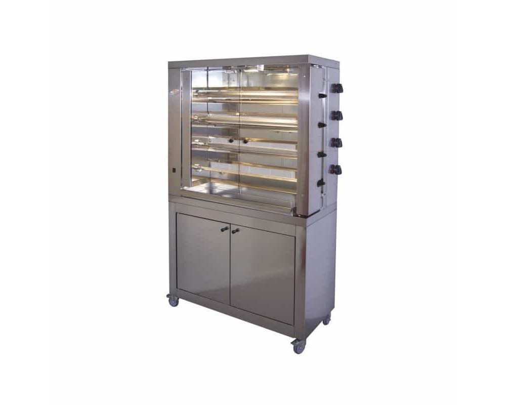 Construction en inox. • Entrainement des broches par chaîne et pignons acier. • ® équipées de poignées athermiques pour faciliter la manipulation et l’embrochage. • Tiroir permettant de stocker vos cuissons et pommes de terre. • Eclairage halogène. • Option : Toit inox et bandeau sérigraphié "rôtisserie". Version électrique : • Alimentation TRIPHASE 380 V. Version gaz : • Alimentation gaz DN 1/2'' (15 x 21) mâle. • Alimentation électrique MONOPHASE 230 V.