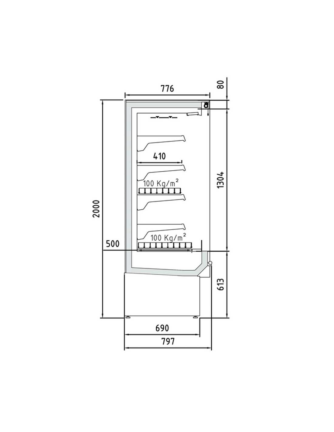 - front.product.mm (front.product.length x front.product.width x front.product.height) : 1310 x 797 x 2000 - T° : -1° +5° - kW (elec) : 1.8
